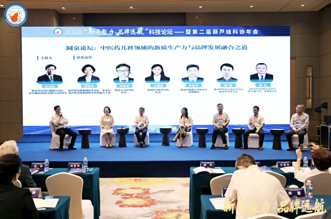 Liu Jingping, Party Secretary and Chairman of Huluwa Pharmaceutical Group; Luo Haibin, Dean of the School of Pharmacy of Hainan University; Wang Yanli, Dean of the School of Pharmacy at Hainan Medical University; Li Zhiping, Senior Advisor of the Hainan Precision Medicine Research Association; Zou Jun, Director of the Clinical Pharmacy Department of the Hainan Women and Children's Medical Center; and Liu Jiang, Party Secretary and Executive Vice President of the Sichuan Traditional Chinese Medicine Information Association, all actively shared their insights during the roundtable forum titled “Integrating New Quality Productive Forces and Brand Development in Pediatric Traditional Chinese Medicine.” Liu Wenmin, President of the Hainan Pharmaceutical Industry Association and Chairman of Qilu Pharmaceutical (Hainan) Co., Ltd., chaired the forum.