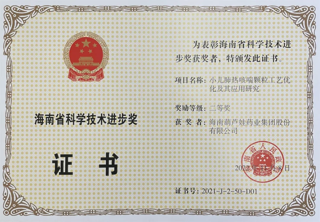 Haikou, November 15, 2022 – At the Hainan Provincial Science and Technology Awards Conference, Huluwa Pharmaceutical Group was honored with the Second Prize of the Hainan Provincial Science and Technology Progress Award 2021 for its research project titled “Process Optimization of Xiao Er Fei Re Ke Chuan Granules and Its Application Research”. The project was led by a team of key contributors, including Liu Jingping, Liu Quanguo, Hu Junbin, Li Peihu, Liu Ping, Wang Jia, Chen Keling, and He Yanbo.